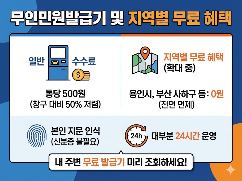 온라인 이용이 어렵다면 근처 행정복지센터나 지하철역에 설치된 무인민원발급기를 이용하는 것이 창구 방문보다 저렴하고 빠릅니다. 2026년부터 용인특례시와 부산 사하구 등 일부 지자체에서는 시민들의 부담을 줄이기 위해 무인발급기 수수료를 전면 면제하는 정책을 시행하고 있습니다.