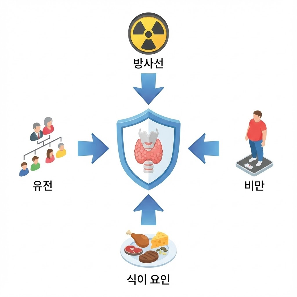 - 비만: 체질량지수(BMI)가 높을수록 갑상선암 발병 위험 증가 연구 결과 존재