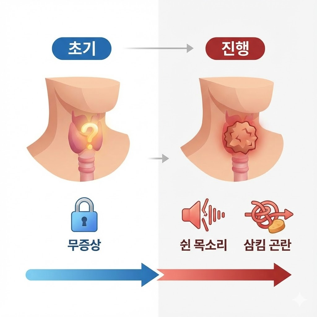 갑상선암은 초기에는 뚜렷한 증상이 없어 '침묵의 질환'으로 불리지만, 암이 커지면서 주변 기관을 압박할 때 특이점이 나타납니다.