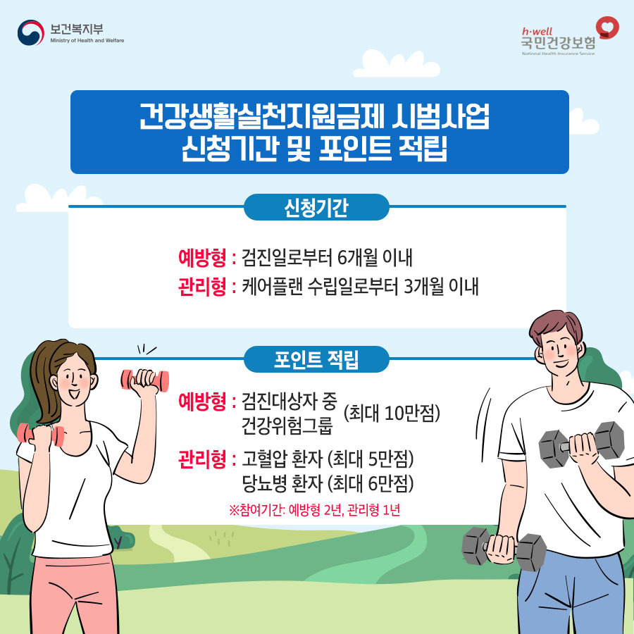 | 예방형 | 만 20~64세 건강검진 수검자 | BMI 25㎏/㎡ 이상 AND 수축기 혈압 130mmHg 이상 또는 이완기 혈압 85mmHg 이상 또는 공복혈당 100mg/dL 이상 (최근 6개월 이내 검진 결과 기준) |