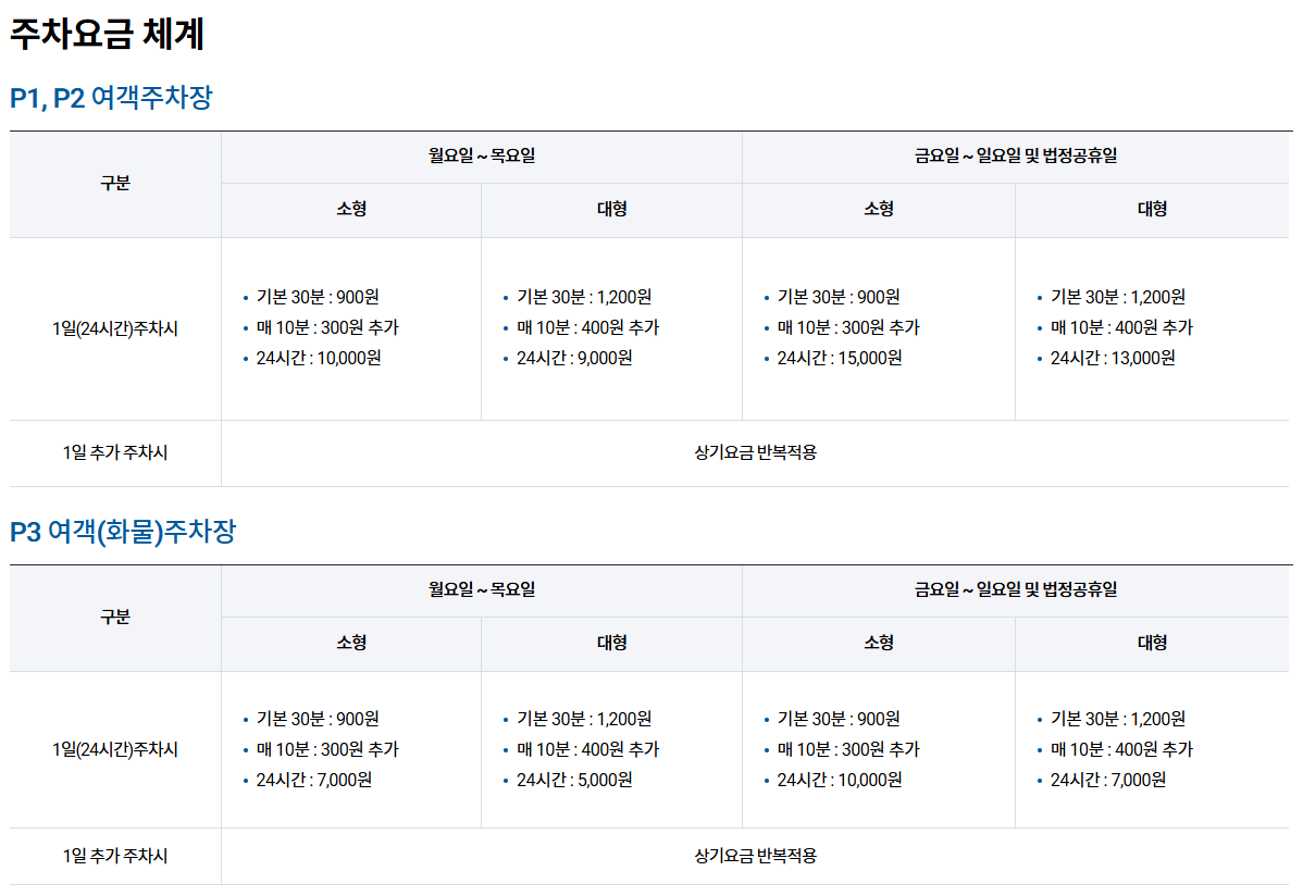| 주차장 | 기본 30분 | 추가 10분당 | 일일요금 (월~목) | 일일요금 (금~일, 공휴일) |