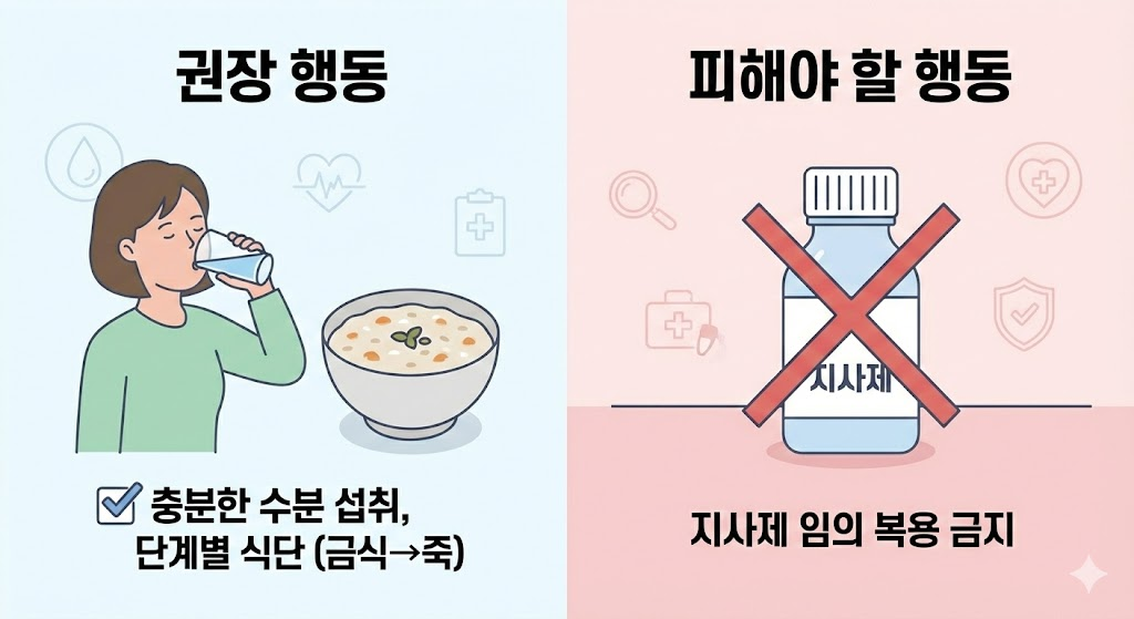 | 급성기 | 금식 및 이온음료 섭취 | 지사제 임의 복용 |
