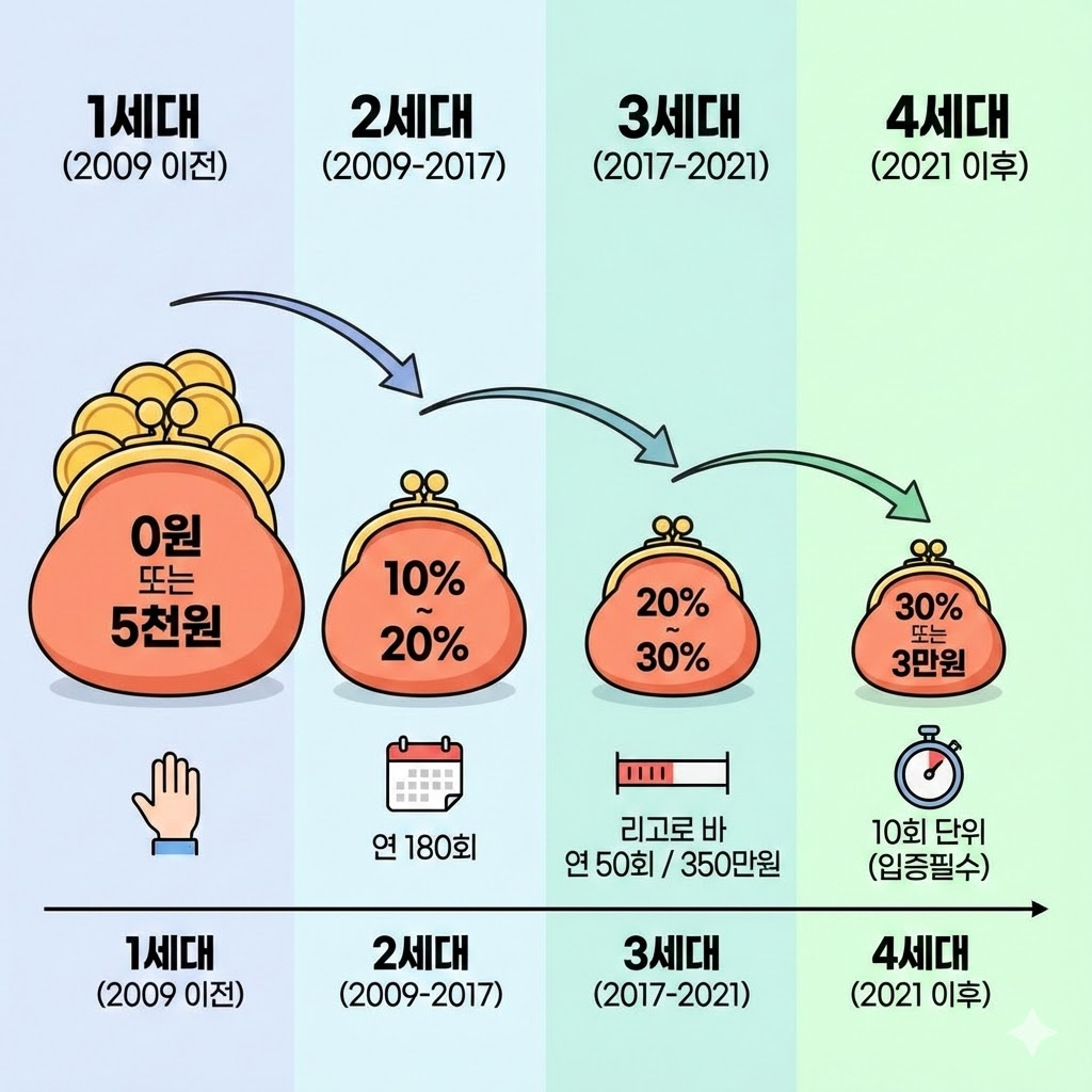 | 3세대 | 2017.04 ~ 2021.06 | 20% ~ 30% | 연 50회/350만원 |