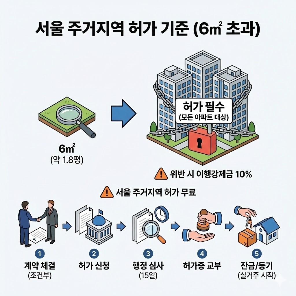 서울시는 투기 수요를 원천 차단하기 위해 법적 기준보다 훨씬 강화된 면적 기준을 적용하고 있어 사실상 모든 아파트가 허가 대상입니다.