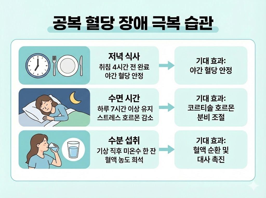 음식만큼 중요한 것이 생활 습관이며 특히 전날 저녁 식사 시간과 수면의 질이 아침 혈당에 직접적인 영향을 미칩니다.