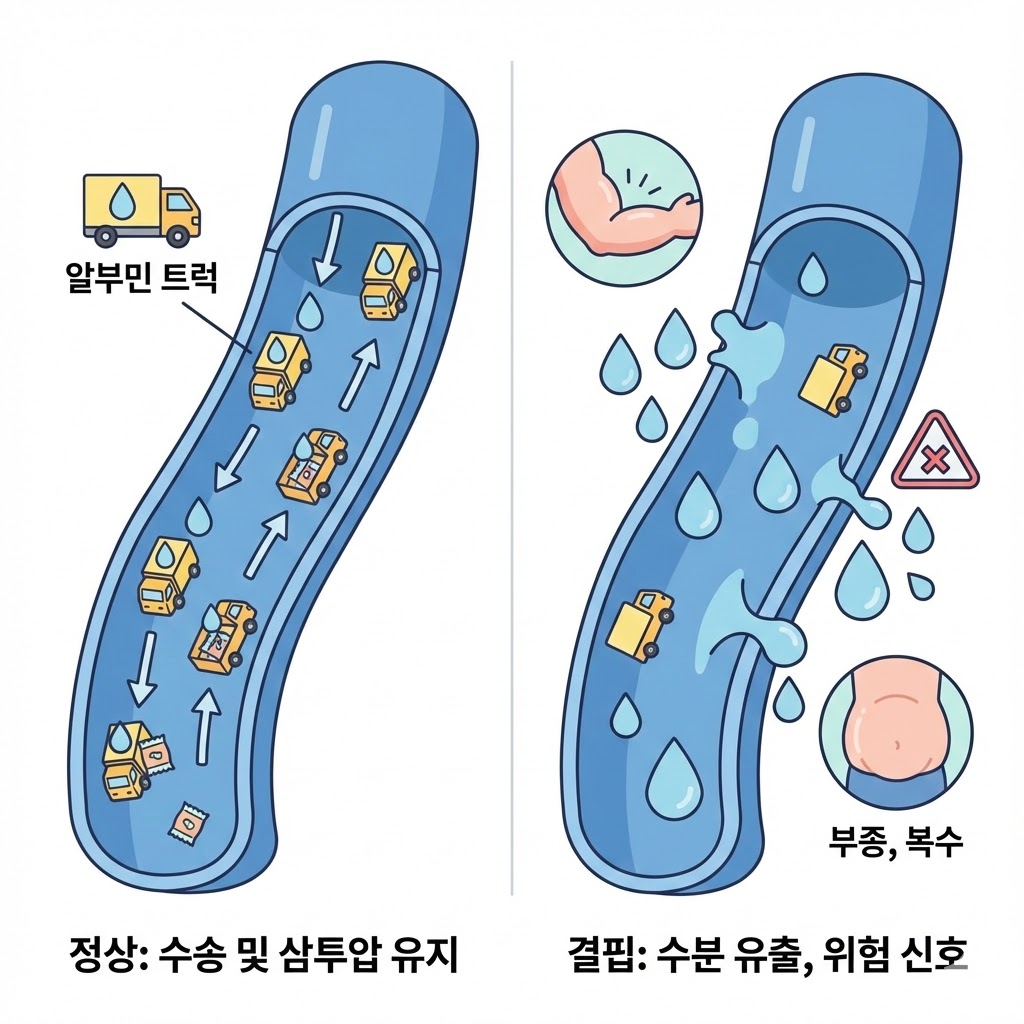 수치가 떨어지면 혈관 밖으로 수분이 빠져나와 몸이 붓고, 독성 물질이 제대로 배출되지 않아 간성혼수 같은 치명적인 상태로 이어질 수 있습니다.