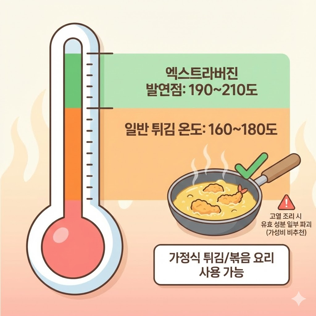 - 엑스트라버진 발연점: 약 190~210도 (품질이 좋을수록 높음)