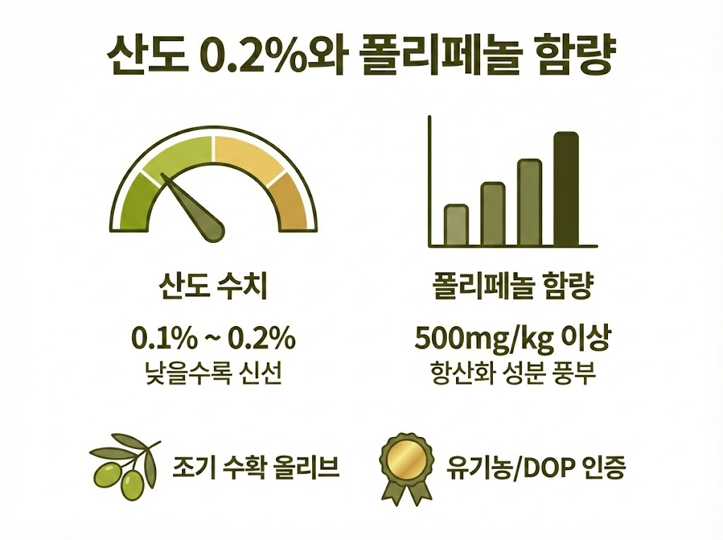 고품질 올리브오일을 결정하는 가장 객관적인 지표는 유리 지방산 함량을 나타내는 산도이며 수치가 낮을수록 신선합니다. 최근 연구에서는 엑스트라 버진 오일의 산도가 낮을수록 발연점이 높아져 가벼운 조리 시에도 안정적임이 밝혀졌습니다.