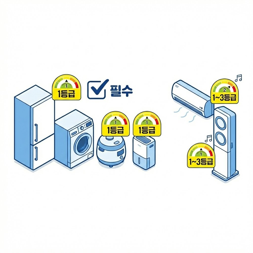 특히 에어컨의 경우 벽걸이형이나 스탠드형에 따라 인정되는 등급 기준이 다르므로 품목별 등급 기준 확인을 통해 구매 전 꼼꼼히 체크하는 것이 필수입니다.