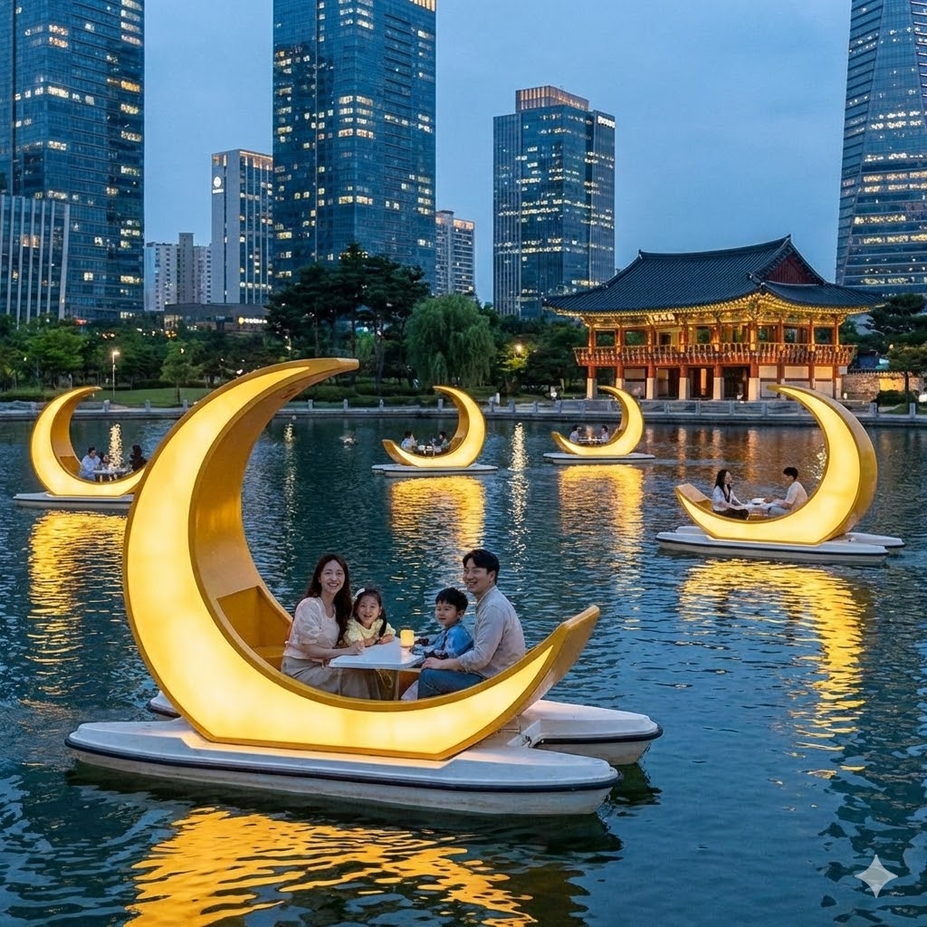 - 문보트: 달 모양의 보트로 블루투스 음악 연결이 가능하여 연인들의 데이트 코스로 인기 만점입니다 (3인승).
