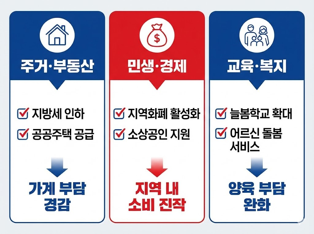 | 주거·부동산 | 지방세 인하, 공공주택 공급 | 가계 부담 경감 및 정주 여건 개선 |