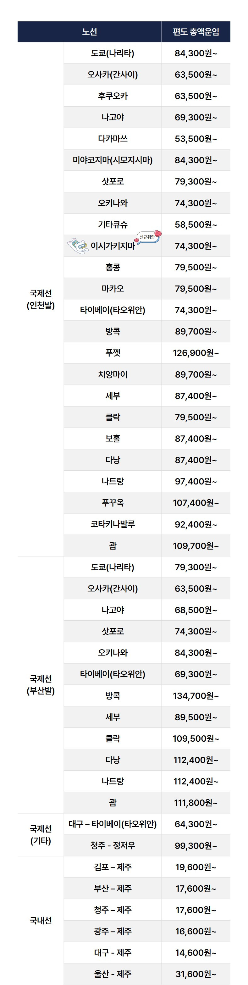 - 총액 운임은 환율, 공항세, 유류할증료 등에 따라 변동될 수 있음