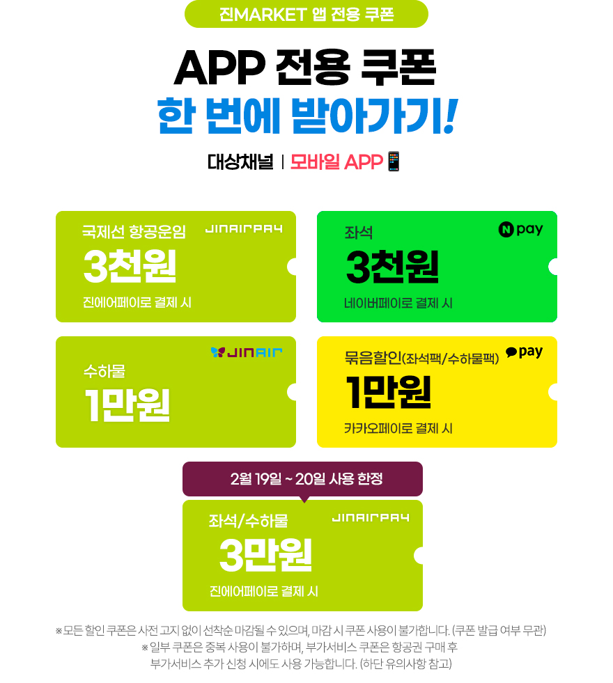 - 간편결제 할인 : 진에어페이, 카카오페이, 네이버페이 이용 시 최대 3만 원 즉시 할인