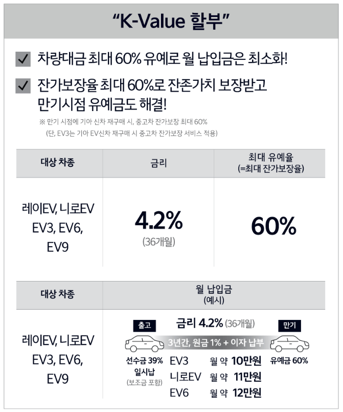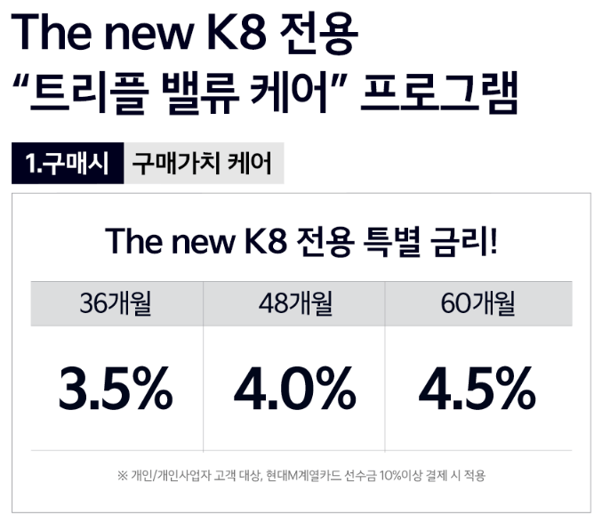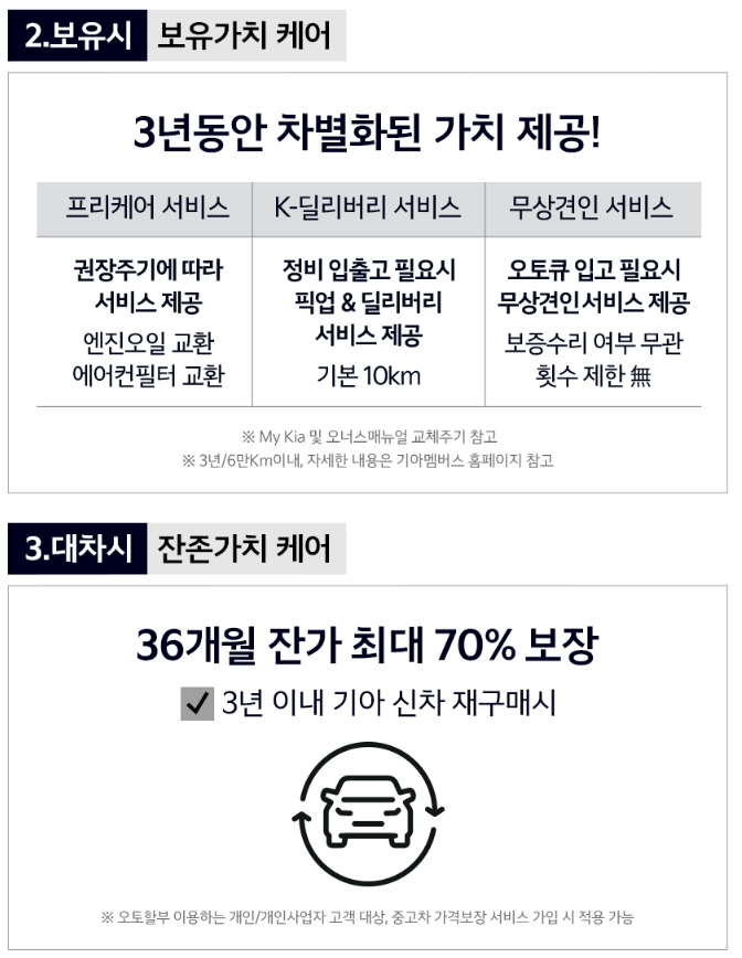 기아자동차는 11월 1일부터 11월 30일까지 11월 한 달간 코리아 세일 페스타에 참여하여 프로모션을 진행하고 있습니다. 여기에 추가적인 할부와 트리플 밸류 케어 프로모션으로 차량 구매의 부담을 줄일 수 있으니 이번 기회를 꼭 잡아보시기 바랍니다.