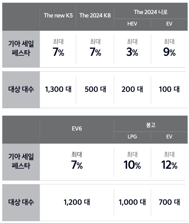 기아자동차에서는 2024년 코리아 세일 페스타 프로모션을 11월 한 달 동안 진행합니다. 최대 12% 할인으로 선착순 5,000대까지 프로모션에 참여가 가능하니 차량 구매를 고려하셨다면 서둘러 참여해보시기 바랍니다.