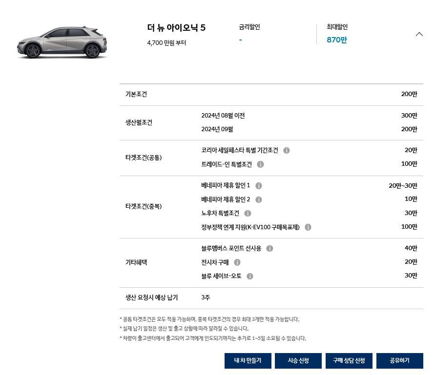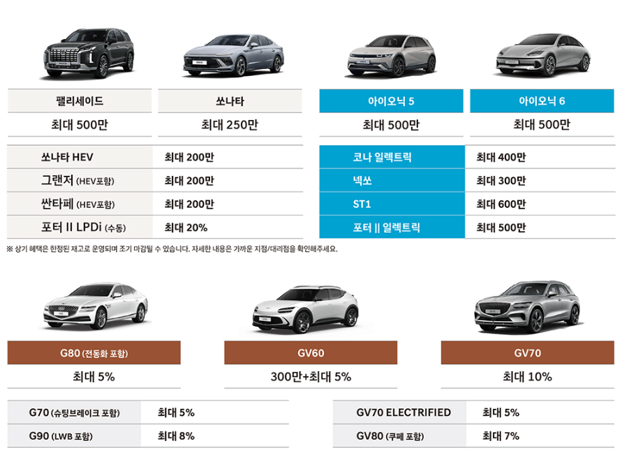 현대차에서 2024년 코리아 세일 페스타 프로모션을 11월 한 달간 진행합니다. 준대형 SUV부터 전기차, 제네시스 차종까지 최대 500만원까지 할인받을 수 있는 프로모션은 한정된 재고로 조기 마감이 예상되니 자동차 구매를 고려하셨던 분이라면 서둘러 프로모션에 참여해 보시기 바랍니다.