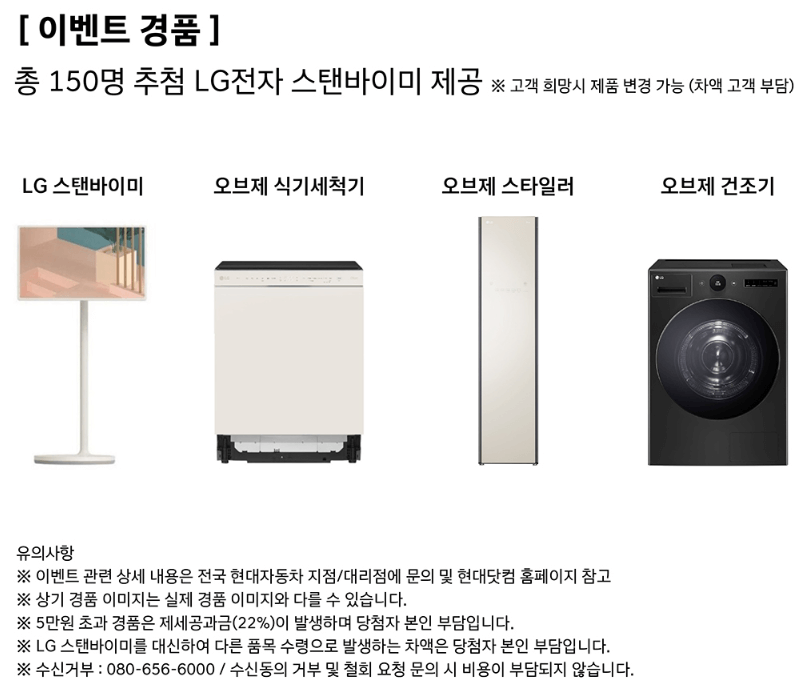 SUV, 승용차, 전기차 차량은 최대 500만원부터 제네시스 차종은 5~10%까지 특별 프로모션 혜택이 적용되는 코리아 세일 페스타입니다. 여기에 추가적인 이벤트를 진행하며 150명 추첨을 통하여 LG전자 스텐바이미를 제공한다고 합니다.