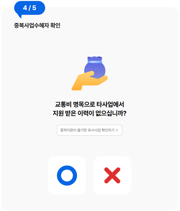 - 타 시도 교통비 지원 사업에 가입된 경우 중복 지원 불가