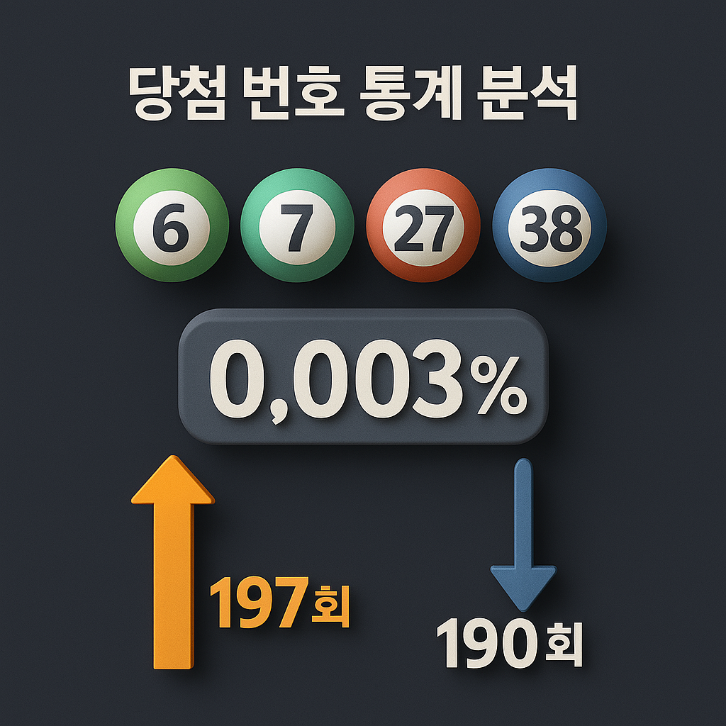 이번 회차의 당첨번호는 6·7·27·29·38·45였습니다. 특히 27번과 38번은 역사적으로도 출현 빈도가 높은 숫자로, 각각 197회와 190회를 기록했습니다. 반면, 6번과 7번의 동시 출현 확률은 0.003%로 극히 낮아, 이번 조합은 통계적으로 희귀한 편에 속합니다.