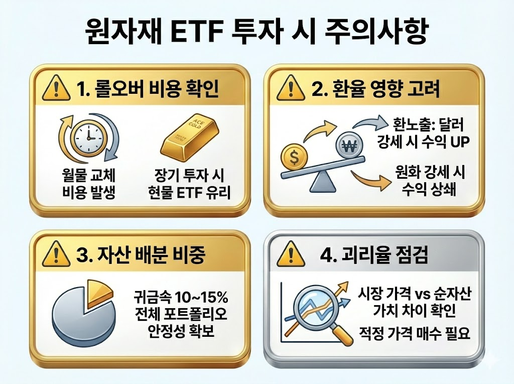 - 롤오버 비용 확인: 선물 ETF는 월물 교체 시 비용이 발생하므로 장기 투자 시 현물 ETF가 유리할 수 있습니다.
