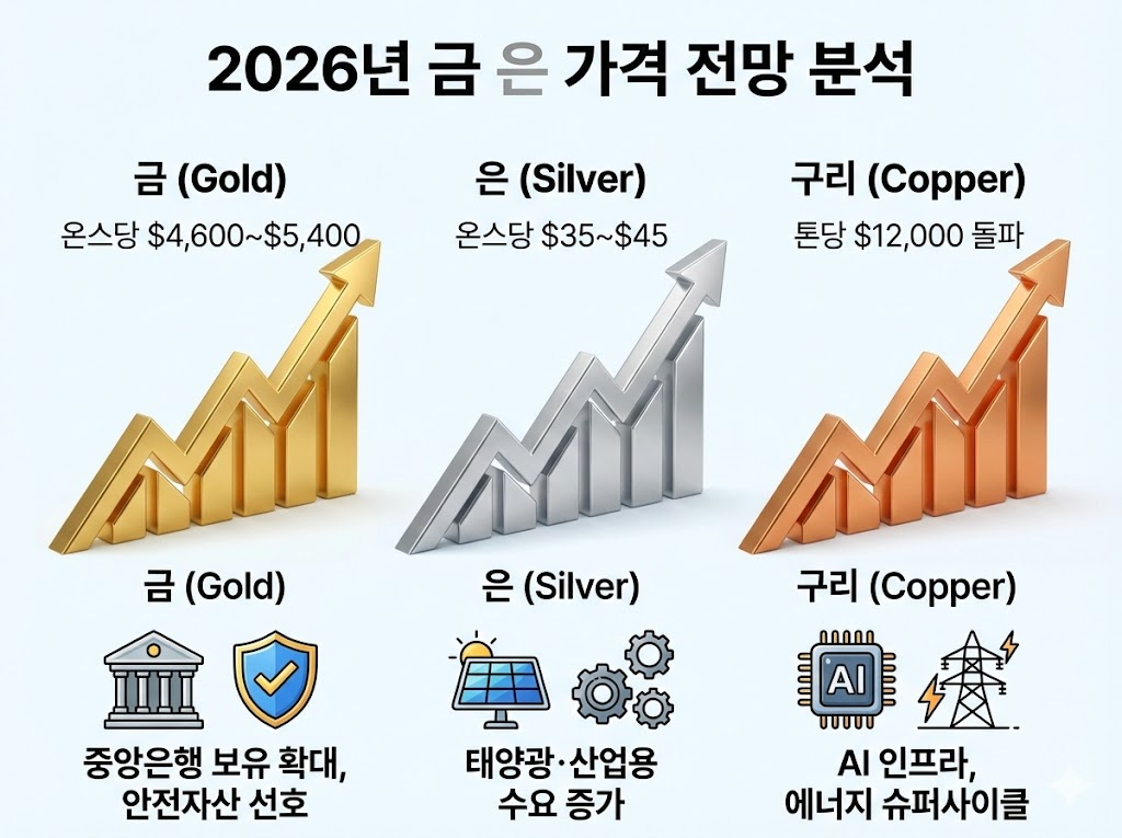 | 금 (Gold) | 온스당 $4,600~$5,400 | 중앙은행 보유 확대 및 안전자산 선호 |