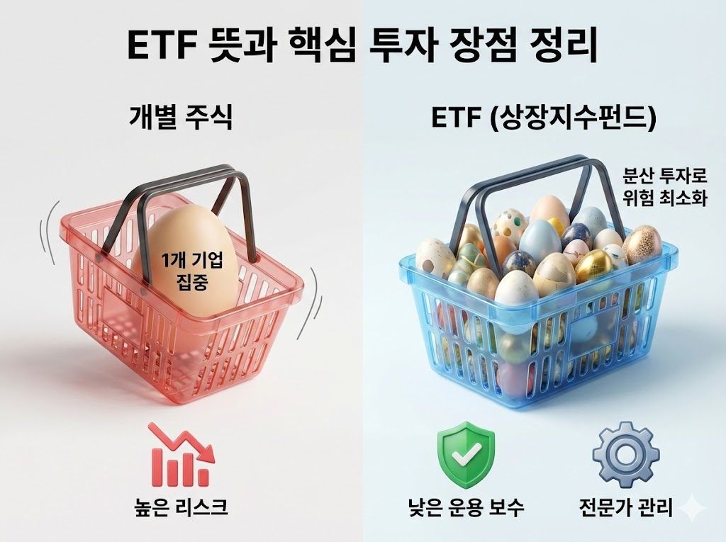 | 구분 | 개별 주식 | ETF (상장지수펀드) |