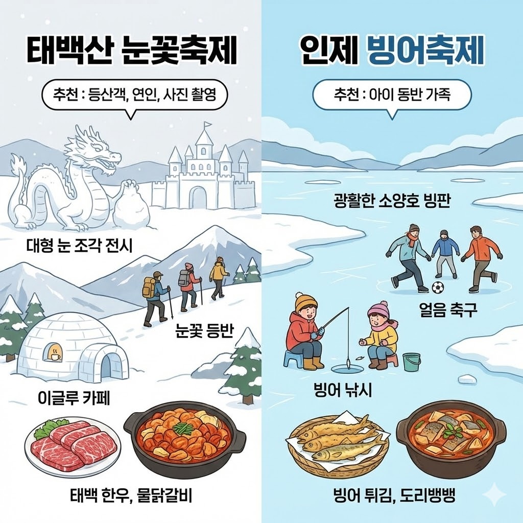 | 구분 | 태백산 눈꽃축제 | 인제 빙어축제 |