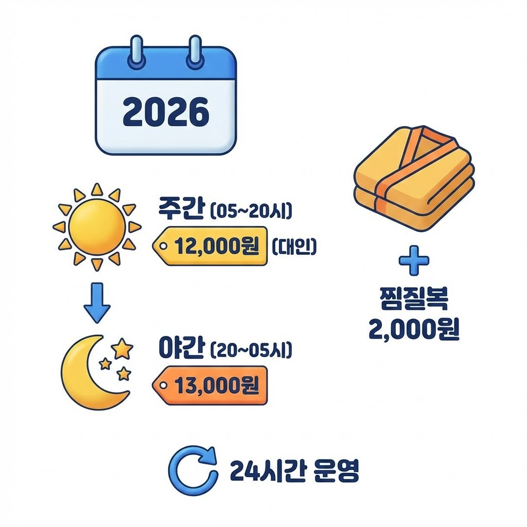 야간 이용 시 1,000원의 할증료가 붙으며 찜질방 이용을 위해서는 입장료 외에 2,000원의 찜질복 대여료를 추가로 지불해야 합니다. 2026년 현재 확인 가능한 최신 공식 자료 기준 연중무휴 24시간 운영되지만 청소 시간에는 일부 탕 이용이 제한될 수 있습니다.