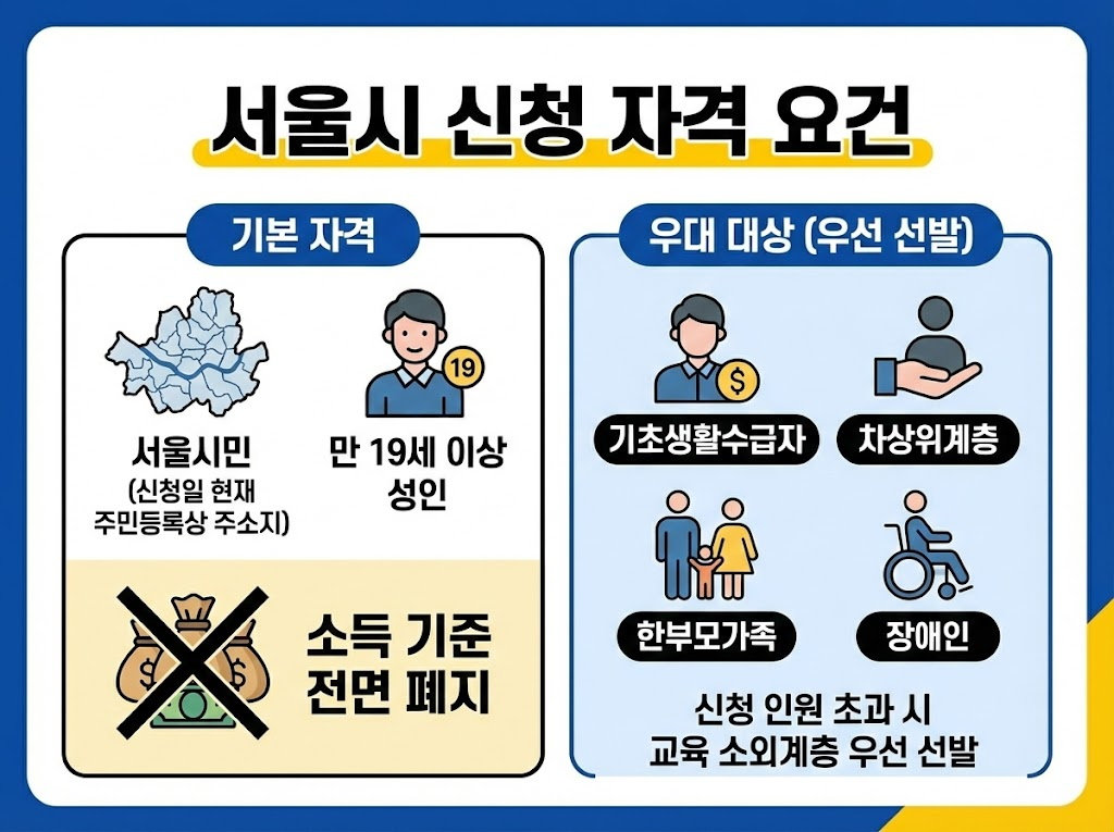 2026년에는 일반 시민을 대상으로 한 소득 기준이 전면 폐지되어 서울에 거주하는 만 19세 이상 성인이라면 누구나 신청할 수 있습니다.다만 신청 인원이 예산을 초과할 경우 교육 소외계층을 우선적으로 선발하며 일반 시민은 추첨이나 선착순으로 결정됩니다.
