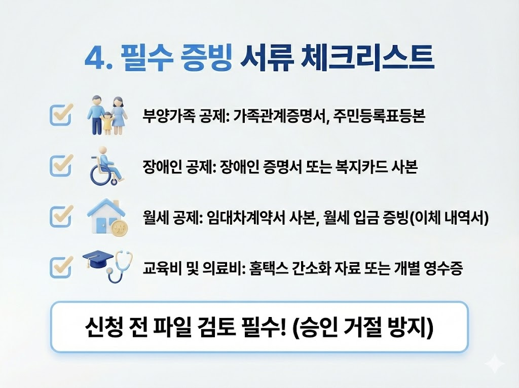 - 장애인 공제: 장애인 증명서 또는 복지카드 사본