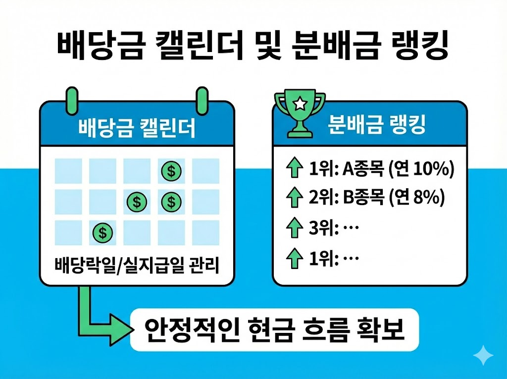 - 분배금 캘린더: 내가 보유한 종목들의 배당락일과 실지급일을 달력 형태로 관리하여 자금 계획을 세울 수 있습니다.