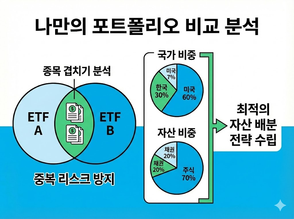 - 종목 겹치기 분석: 서로 다른 ETF를 샀지만 실제로는 같은 주식을 중복해서 보유하고 있는 비중을 계산해 줍니다.
