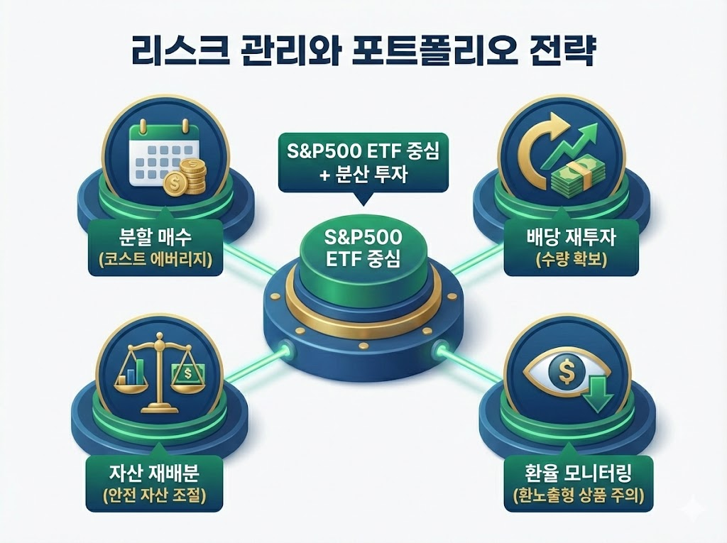 시장의 변동성에 대비하기 위해 S&P500 ETF를 중심으로 하되 자산의 일부를 배당 성장주나 채권 ETF에 분산하는 전략이 2026년 하반기 변동성 장세에서 유효합니다.