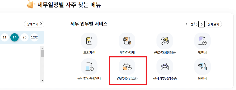 로그인 후, 메인 페이지 "세무일정별 자주 찾는 메뉴"에서 "연말정산간소화"를 선택해 줍니다. 이 메뉴에서는 현재까지의 지출 내역 및 예상 세액을 미리 확인할 수 있습니다. 이 정보를 통해 자신이 연말정산에서 어떤 혜택을 받을 수 있을지 미리 가늠해 볼 수 있습니다.